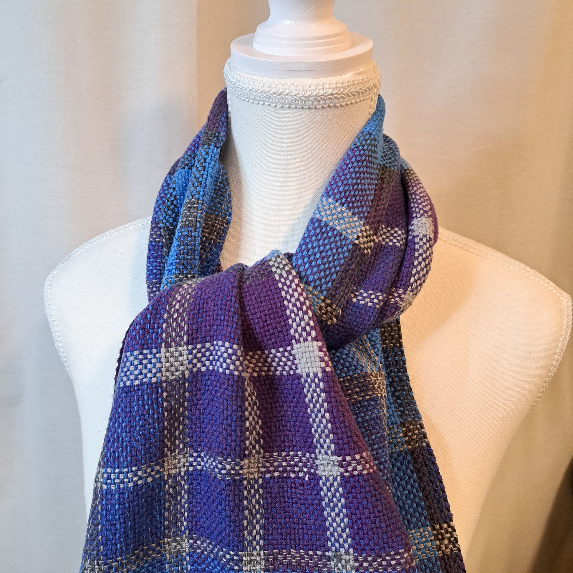 This handwoven scarf made of 100% cotton, making it soft and squishy as well as easy to care for (it can be machine washed if needed, though hand-washing will extend the life of the garment). Both vertically and horizontally, the scarf intersperses narrow gray stripes (ranging from near black to pale gray) with wider colored stripes (ranging from light blue to dark blue to purple). Each horizontal stripe involves a break in the yarn to change to color, and the result is a fun grid of blues and purples!